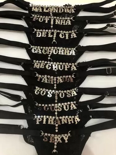 Sua parte frontal é trabalhada em renda, suas alças finas com regulagem. A parte de trás conta com strass e nomes sugestivos.