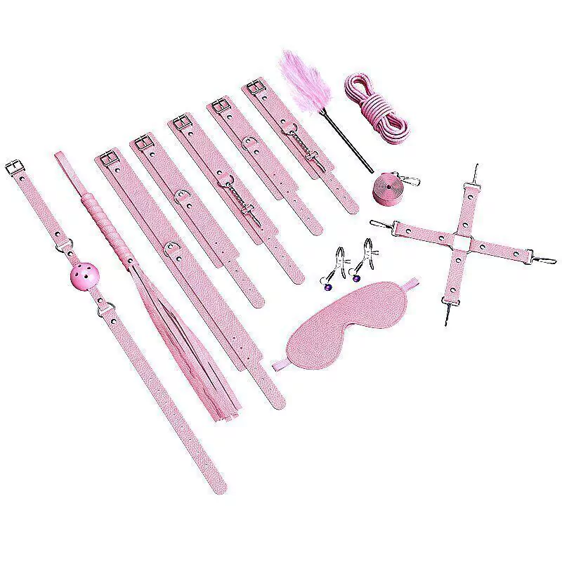 Kit Bondage é um kit sado com 10 itens, sendo eles venda, mordaça, algema, tornozeleira, coleira, guia, chicote e corda, prendedor de Mamilo, Pena estimuladora.
