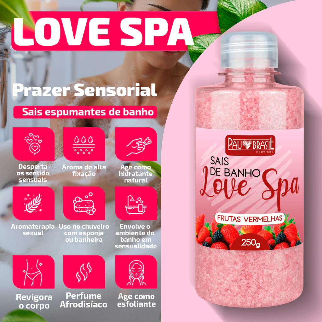 Cuidar do seu bem nunca é demais, para incrementar a sua rotina e deixar seus banhos ainda mais envolventes, a aposta é somente uma, os Sais de Banho da Linha Love Spa é aquele produto que vai se tornar indispensável na sua vida. Os sais te ajudam a cuidar de si mesma(o) de uma maneira relaxante e sensual, além é claro de hidratar a pele e deixar uma deliciosa fragrância envolvente e afrodisíaca no ar.